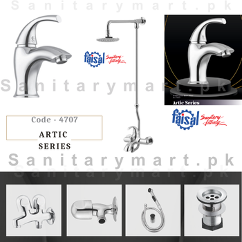 Faisal Sanitary fittings – Complete Artic Series Single Lever bathroom Shower Set – Single Lever Basin Mixer Item # 4701 – Wall Shower / Hand Shower Type Item # 4702 – Double Bib Cock Item # 4703 – Tee Stop Cock Item # 4704 – Waste Basin Item # 4705 – Toilet Shower Complete With pipe Item # 4706