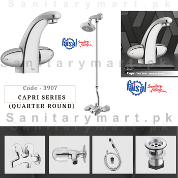 Faisal Sanitary Fittings – Capri Series – (Quarter Round) Basin Mixer Item # 3901 – Wall Shower / Hand Shower Type Item # 3902 – Double Bib Cock Item # 3903 – Tee Stop Cock Item # 3904 – Waste Basin Item # 3905 – Toilet Shower Complete With pipe Item # 3906